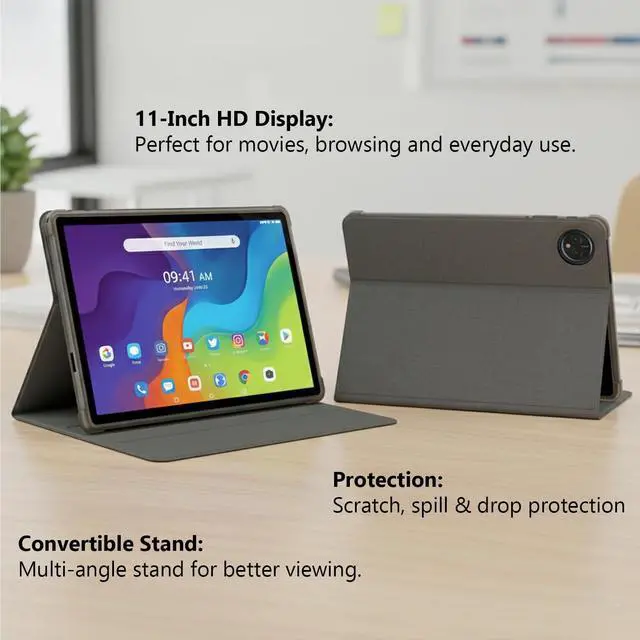 Convertible Stand: Includes a durable case that safeguards your tablet from scratches and everyday drops, and easily folds into a stable stand for hands free viewing.