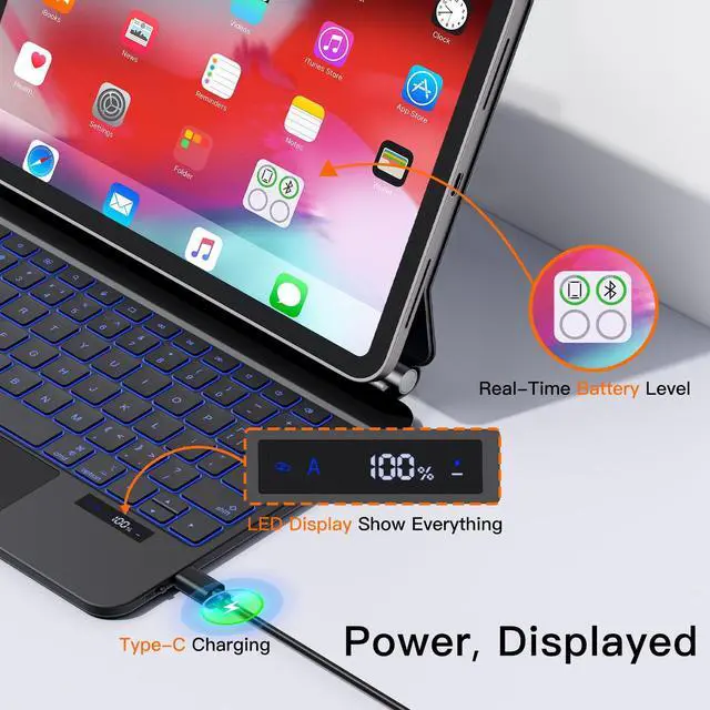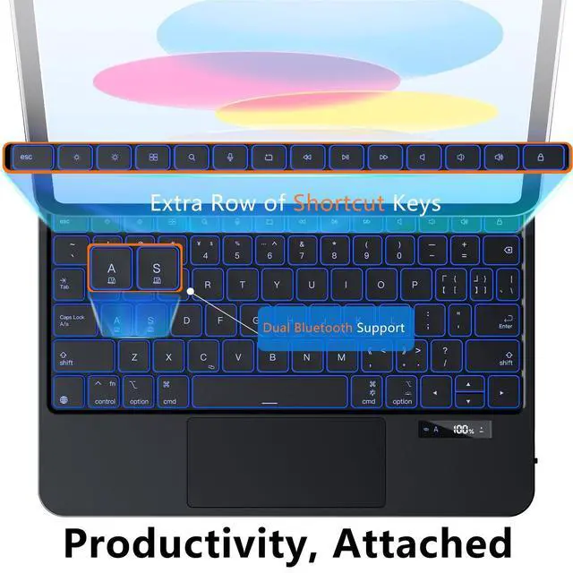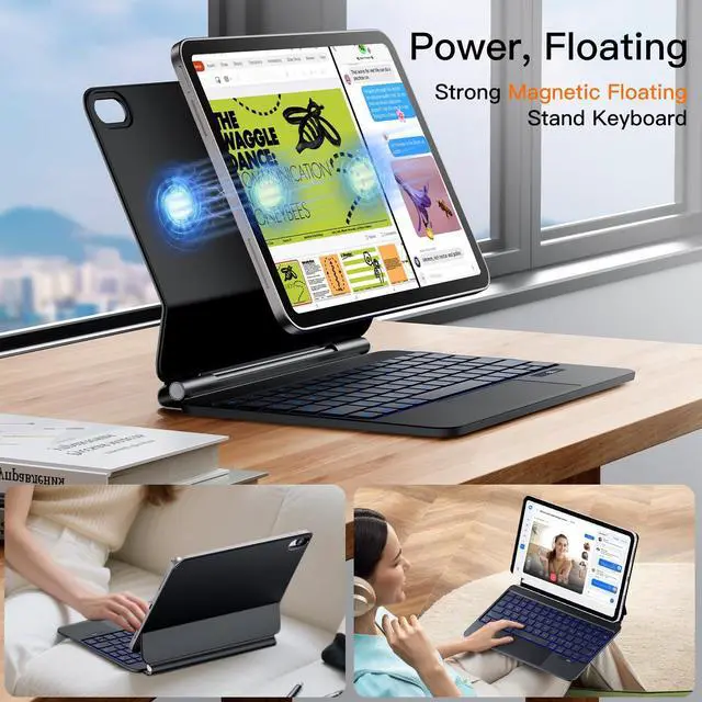 (Note: This product is NOT suitable for iPad Pro 11 inch & iPad Air 11-inch. Please verify your tablet model before purchase. ) ^^ EFFICIENCY, UNLOCKEDOur 6-Row keyboard puts media controls, brightness, and shortcuts at your fingertipsinstantly. Why press two keys when one will do? With a full 6th row of dedicated keys, you skip the Fn combos, no more hidden functions, get to work 41% faster ^^ See EverythingTired of deciphering blinking lights? Our Magic Keyboard features a crisp, integrated LED Display that puts all the essential information right in front of you. See the exact battery percentage, know your Bluetooth connection status, check Caps Lock, and monitor charging progress at a glance ^^ Bluetooth 5.3 with Dual-ChannelBluetooth 5.3 delivers a faster, more stable connection with lower latency. Dual-channel technology allows you to pair with 2 deviceslike your iPad and phone. This is multitasking made effortless, keeping you in your flow whether youre working, messaging, or creating ^^ PRECISION TOUCHPADExperience smooth control with our professional trackpad. With PixArt sensor and featuring 5-point multi-touch, it enables multi gestures for effortless navigation.