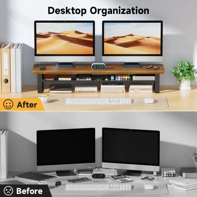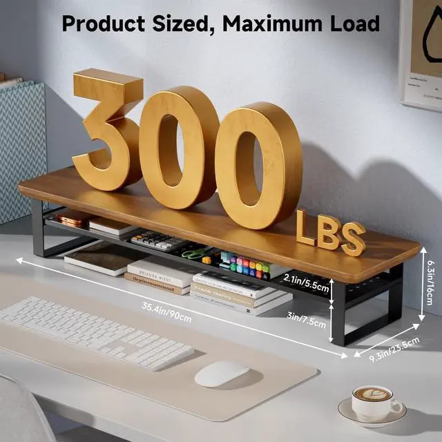 Large Monitor StandMeasuring 35.4"L x 9.3"W x 6.3"H, this expansive monitor stand offers a wide and stable platform capable of holding dual monitors, a laptop, and even a TV simultaneouslyperfect for both multitasking and entertainment setups. It transforms your desk into an organized, clutter-free command center that maximizes productivity and enhances your visual experience. ^^ 2-Tier Desktop OrganizerThe desk shelf features a smart two-tier design that instantly doubles your usable space. The top tier elevates your monitors or laptop to an ergonomic height, while the lower tier provides organized storage for accessories, documents, and tech gear.