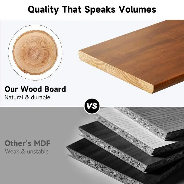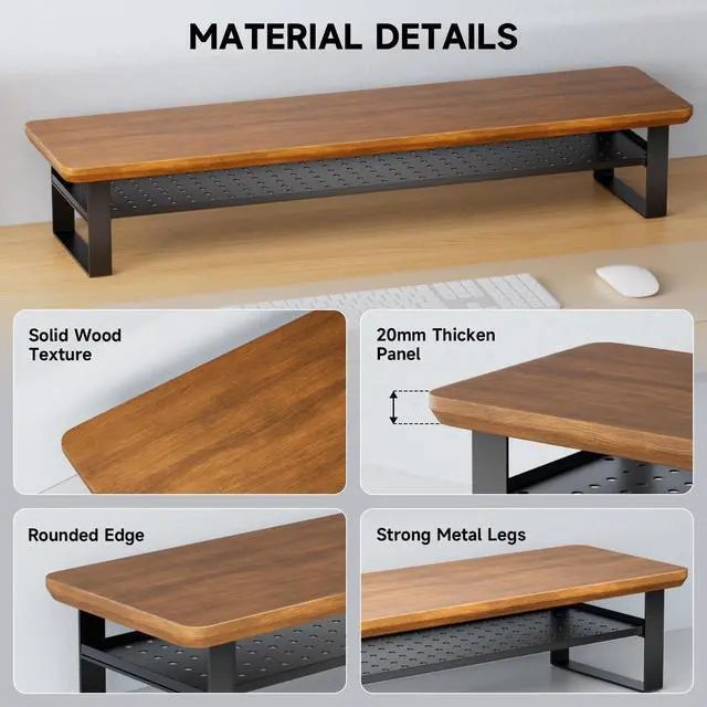With an open-back design for easy cable management, it transforms cluttered desks into clean, productive workspacesperfect for home offices, gaming setups, or shared workspaces. ^^ Strong & Stable DesignBuilt from high-quality wood and metal, this monitor stand features a thickened 20mm ( 0.79 inch) panel that provides robust support for loads up to 136kg (300lbs). Engineered for lasting stability, it offers secure and wobble-resistant support for your monitors. Additionally, the smooth rounded corner design ensures safe handling, preventing bumps or scratches during use. ^^ Ergonomic Design Monitor StandOur monitor stand is ergonomically engineered to lift your screen to the ideal viewing height, aligning with your natural eye level to promote healthy posture.