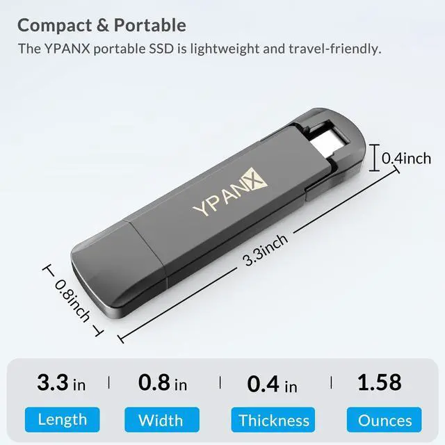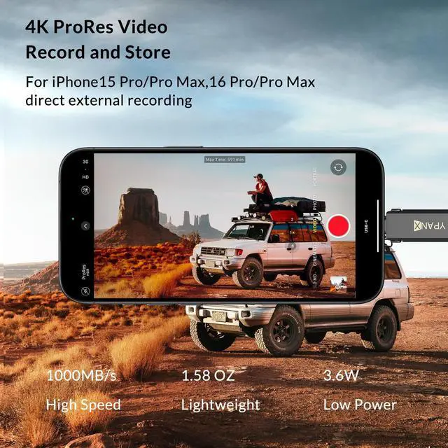 (Note: USB 3.2 performance requires a compatible USB 3.2 port. ) ^^ 4K ProRes HDR SupportRecord and save 4K ProRes HDR videos directly from your iPhone 15 Pro/16 Pro or Pro Max to the SSD without the hassle of secondary transfers. Seamlessly enhance your video recording and editing workflow with this external storage solution. ^^ Compact, Portable & Widely CompatibleMeasuring just 3.3 x 0.8 x 0.4 inches and weighing only 1.58 ounces, the YPANX portable SSD is lightweight and travel-friendly. Its USB 3.2 Gen2 and Type-C dual ports ensure broad compatibility with iPhone 15/16 series, Android USB-C devices, desktops, laptops, car audio systems, smart TVs, PS5, and more.