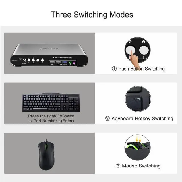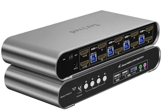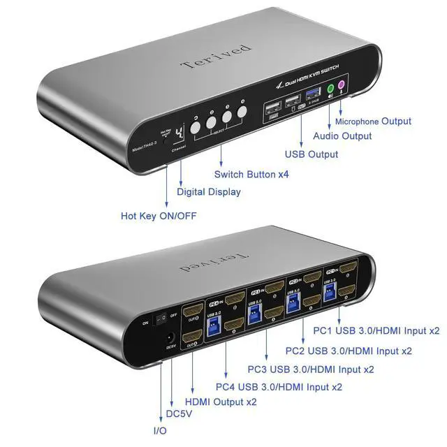 RGB 4:4: 4, HDR10, and HDMI 2.0; compatible with 2K@144Hz for high-refresh performance. ^^ USB 3.0 HUB & AUDIO Integrated USB 3.0 ports for fast data transfer plus audio and microphone support, perfect for conferencing, gaming, and content creation. ^^ EASY HOTKEY SWITCHING Switch computers instantly via keyboard shortcuts or the front panel buttons; auto-scan and customizable auto-switch timer included. ^^ PREMIUM ALUMINUM DESIGN Durable aluminum alloy shell offers premium look, excellent heat dissipation, and robust build quality for long-lasting performance.