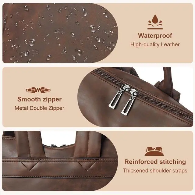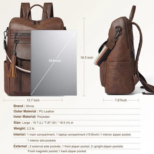• Leather Laptop Backpack for Women:Laptop backpacks made of soft and durable faux leather and fabric lining,thick shoulder straps,unique leather handles,no-slip zippers.The heavy-duty laptop backpack women features a total of 2 compartments and 11 pockets,making it easy to organize all work necessities,college supplies,and travel essentials,with dimensions of 16.5" x 15.7" x 7.8" and a weight of 2 lbs