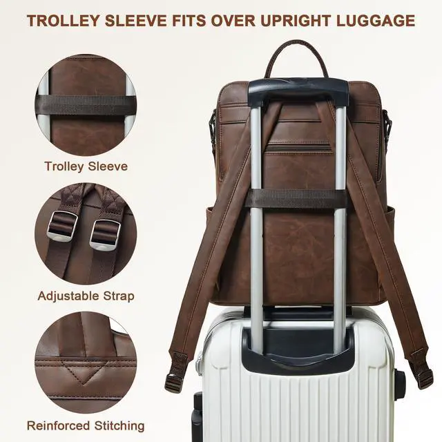 Women: Laptop backpacks made of soft and durable faux leather and fabric lining, thick shoulder straps, unique leather handles, no-slip zippers. The heavy-duty laptop backpack women features a total of 2 compartments and 11 pockets, making it easy to organize all work necessities, college supplies, and travel essentials, with dimensions of 16.5" x 15.7" x 7.8" and a weight of 2 lbs ^^ Fashion Padded Computer Backpack Laptop Bag: Work backpack Fit up to 15.6" laptops well. This purse backpack for women is padded on bottom. When traveling with this travel backpack and your suitcase, you can utilize the luggage strap attached to the leather laptop backpack for women, eliminating the need to carry it on your shoulders and effortlessly alleviating physical strain ^^