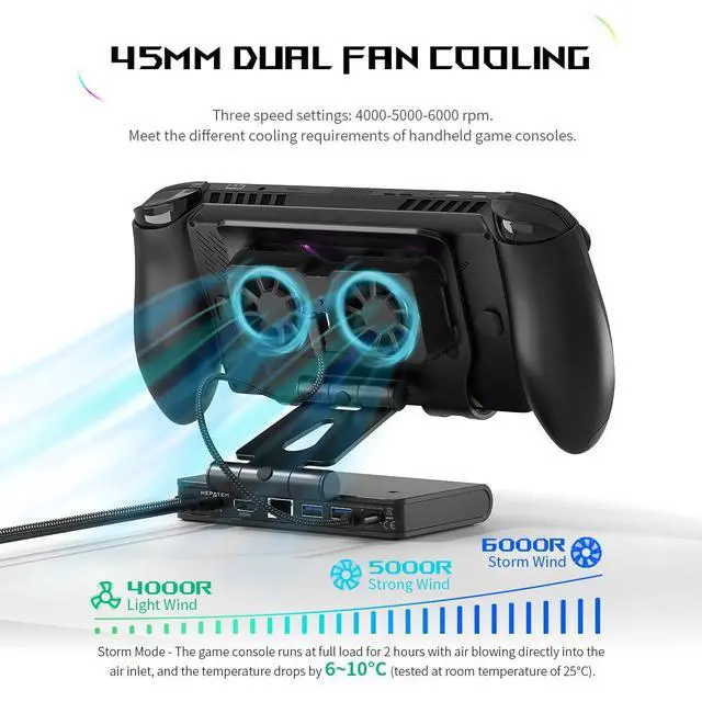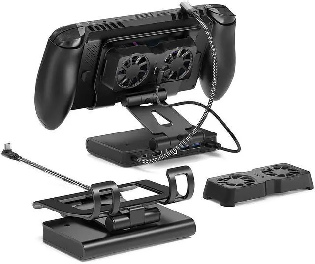 Upgrade your gaming experience with our Detachable Magnetic Dual-Fan Cooling Dockthe ultimate 3-in-1 solution for serious gamers. This versatile kit delivers advanced cooling + expanded connectivity + a stable stand in one sleek package. Whether you're battling intense bosses on the go or connecting to a big screen at home, this dock ensures lower temperatures, zero lag, and total convenience. Compatible with ROG Xbox Ally X (2025), ROG Ally X, ROH Ally, Switch 2, Steam Deck (OLED), Leveno Legion Go, Legion Go S, OneX Player Series, MSI Claw Series, and other handheld consoles.