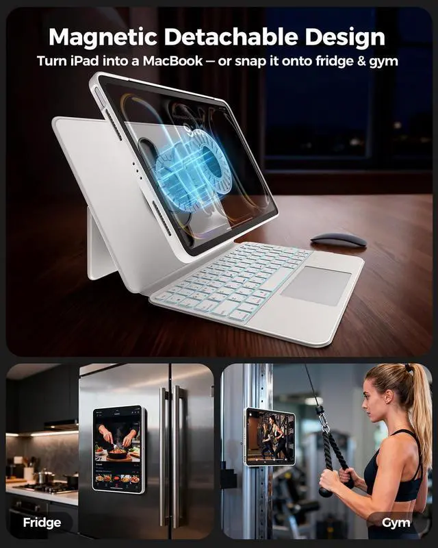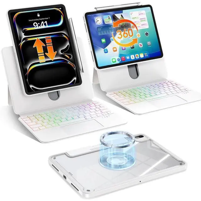 Back Case: it delivers full protection when attached (ideal for on-the-go use), and transforms into a magnetic transparent shell once removedshowcasing your iPads original look without hiding its design. The shells strong magnet lets it stick to surfaces like fridges, making it easy to watch videos while cooking, or to gym machines for hands-free workout guidance ^^ 360 Magnetic Rotation -