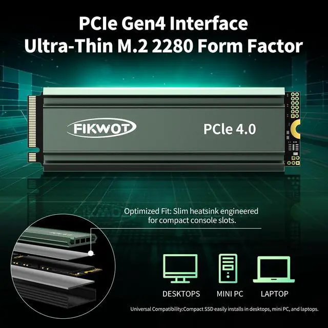 EXCELLENT PERFORMANCE - Fikwot FN960 M. 2 SSD 2TB adopts M. 2 PCIe Gen4 x4 technology and is compatible with NVMe 1.4 protocol. The maximum read speed of this NVME 2TB SSD is as high as 4, 800MB/s, and the maximum write speed is as high as 4, 200MB/s. It is equipped with a dynamic SLC cache to effectively maintain the high-speed operation and stability of the SSD. ^^ WIDELY COMPATIBLE - Use PCIe Gen4 x4 SSD to expand your PS5 storage capacity, and the Heatsink can be installed together with the product on the PS5 console to provide you with a better gaming experience.