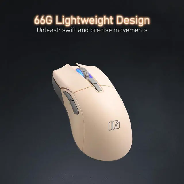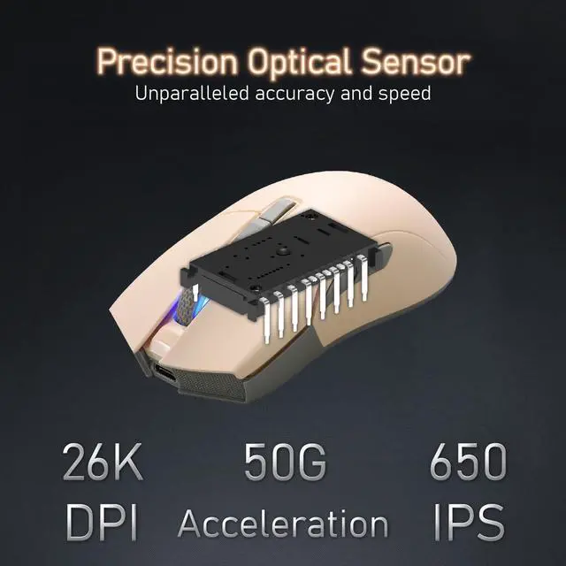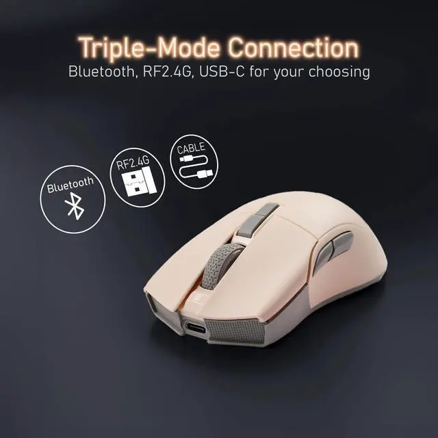 High Efficiency Triple Mode Beige Gaming Mouse 2.4G /Bluetooth/detachable USB-C cable wired mode for easy recharging and flexibility in connecting to a computer. Lightweight design, only 66 grams, to alleviate the burden on the wrist during gameplay. ^^ PixArt PAW 3395 Optical Sensor adjustable DPI up to 26, 000 dpi resolution. You can promptly adjust the moving speed for a fast response during gaming. ^^ Programmable Software convenient for DPI adjustment, programmable key functions, and light switching. Also, combining onboard memory for customized settings on the go. ^^ Kailh GM 8.0 Microswitches it provides 80 million times click ability.