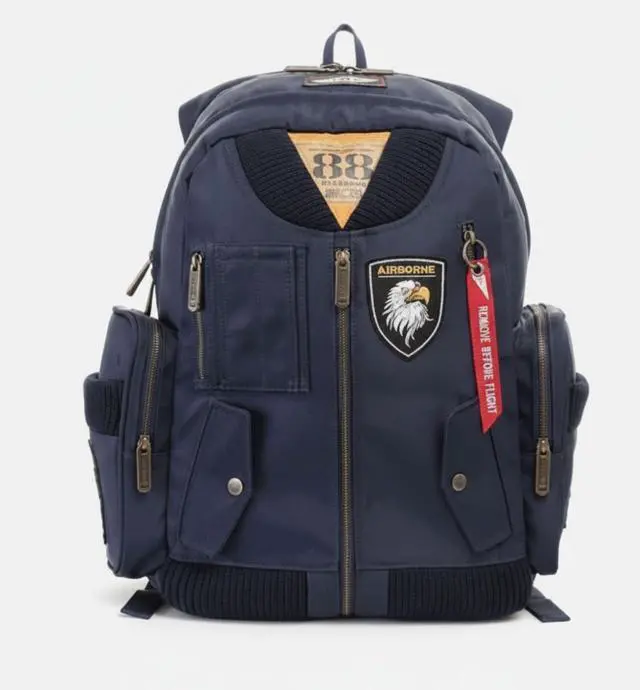 Timeless MA-1 Bomber Jacket Inspiration: The Airborne backpack pays homage to the iconic MA-1 flight jacket, a global fashion staple, blending its classic design with modern utility. Featuring scratch and water-resistant fabric, a fully lined interior, and antique brass buttons with a waterproof zipper.
