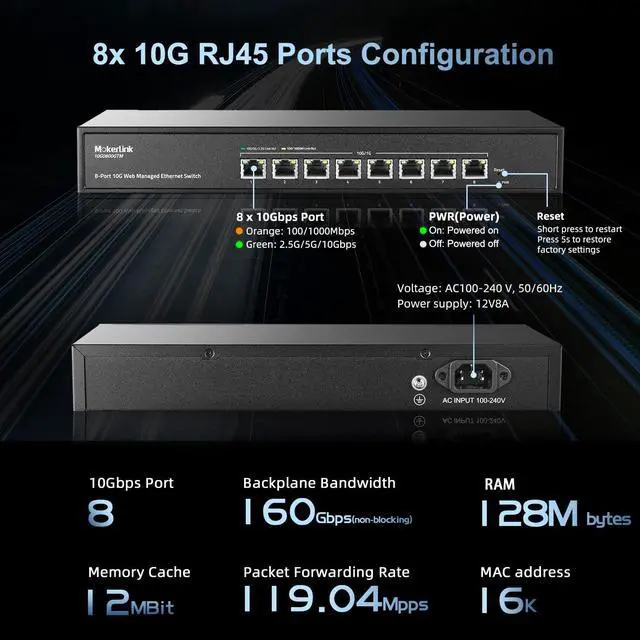 Ports: 8 x 10Gbps ethernet ports, enable high-bandwidth connected, every port auto-adaptive 10G/5G/ 2.5G /1000M/100M, support wider rate range. Automatically adapts to different rate class devices ^^