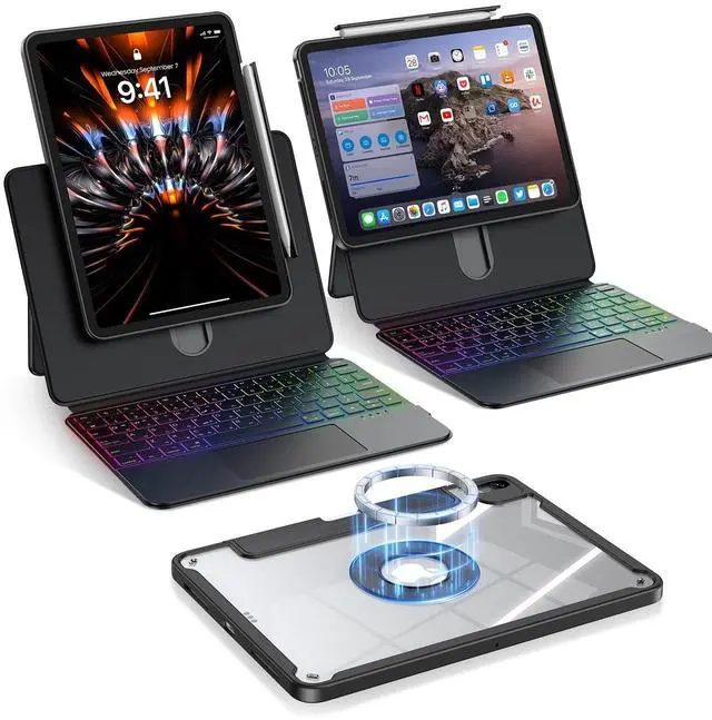 Back Case: it delivers full protection when attached (ideal for on-the-go use), and transforms into a magnetic transparent shell once removedshowcasing your iPads original look without hiding its design. The shells strong magnet lets it stick to surfaces like fridges, making it easy to watch videos while cooking, or to gym machines for hands-free workout guidance ^^ 360 Magnetic Rotation -