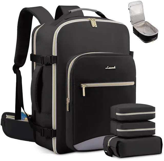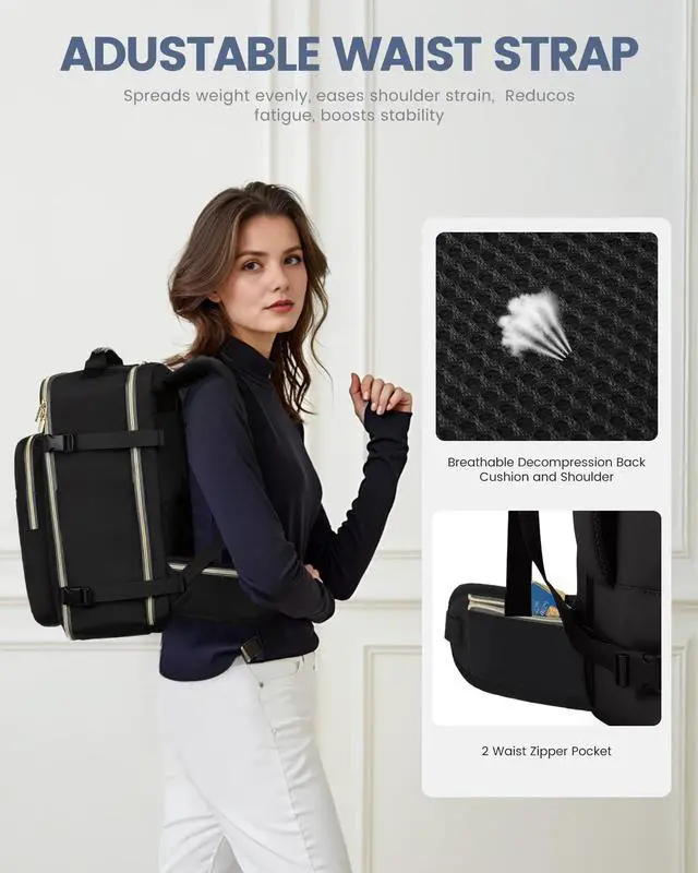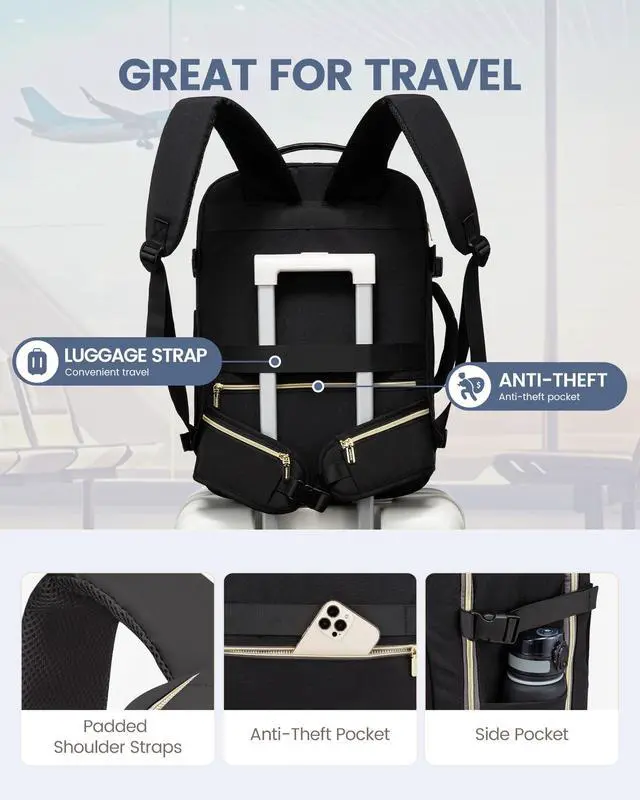 Large Capacity & Multiple Pockets: The travel backpack has a 40L large capacity and 4 main compartments, which can meet daily and travel needs. The travel backpack for women's main compartment can store a lot of things, including 5-8 pieces of clothing, shoes, books, and many other items. The separate laptop compartment is padded with EVA foam to provide the best protection for your 17" laptop and 12.9" iPad. The front compartment has many pockets to keep your belongings organized. ^^