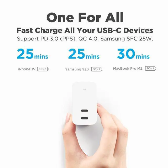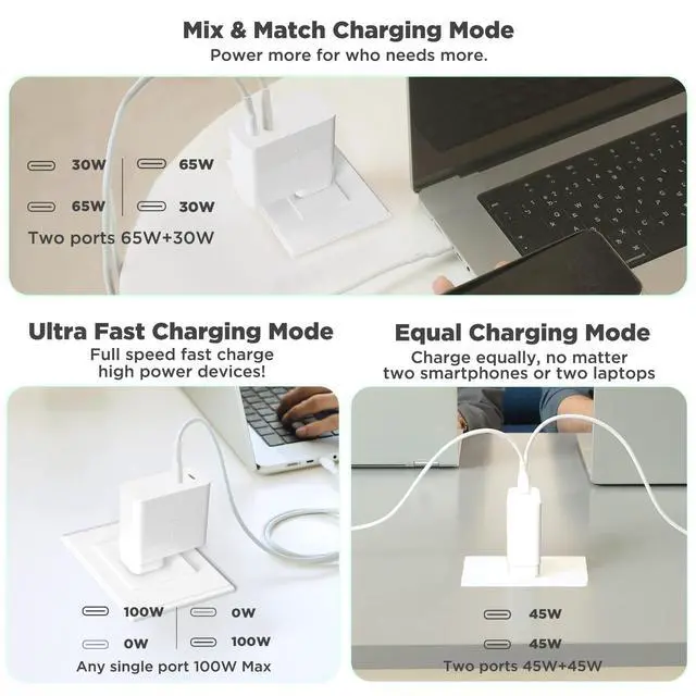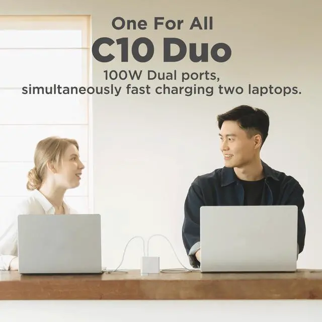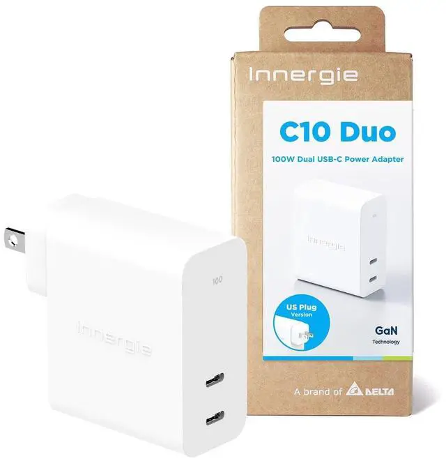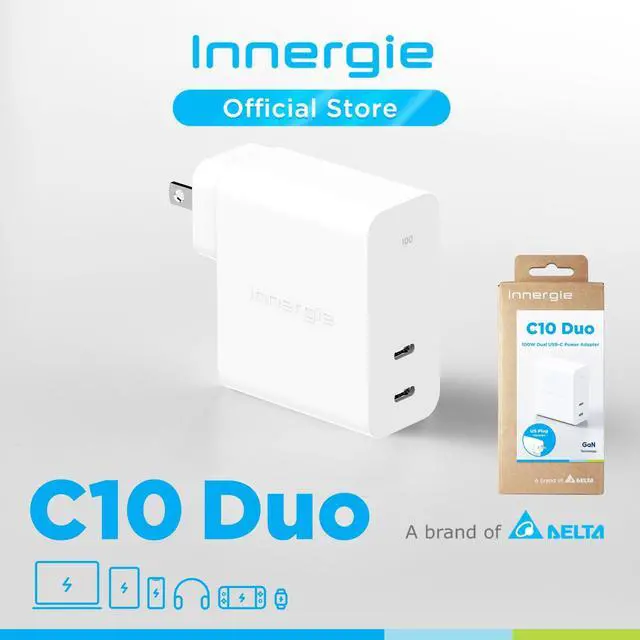 Innergie 100W dual ports charger - C10 Duo simultaneously fast charging two laptops or fast charge a laptop and a smartphone. ^^ Upgraded with GaN, supports PD 3.0 (PPS), QC 4.0, Samsung SFC 25W fast charge protocol. ^^ Unique Innergie 3 Fast Charge Modes - Either port can reach up to 100W when one device is charged. Reach up to 30W/6W or 65W/30W or 45W/45W when two devices are charged simultaneously. ^^ 75% PCR (Post-Consumer Recycled) plastic material. Best choice to reduce charging footprint. ^^ Made by global power expert, Delta Electronics for 3 years quality assurance.