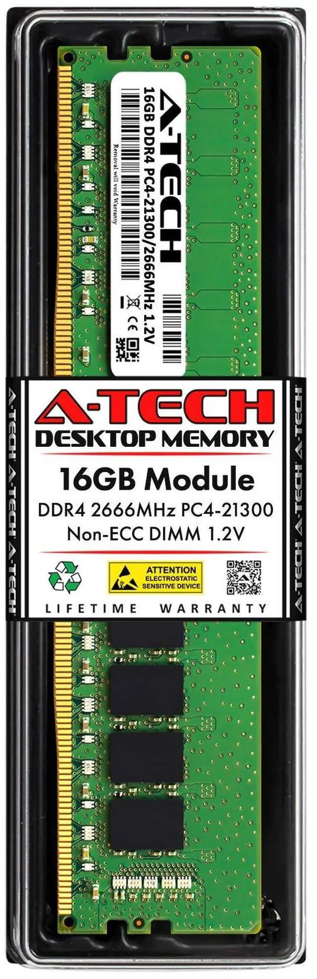 Compatible with select DDR4 Desktop computers + Easy to install at home, no expertise required ^^ Maximize your system's performance, boost loading speeds and multitask with ease ^^ Backed by A-Tech's Lifetime Warranty + Friendly tech support team available to help before and after your purchase ^^ Single 16GB RAM Module ^^ DDR4 DIMM 288-Pin ^^ Speeds up to 2666MHz (2667MHz), PC4-21300 / PC4-2666V ^^ NON-ECC Unbuffered ^^ 1Rx8 or 2Rx8 - Single or Dual Rank ^^ JEDEC DDR4 standard 1.2V