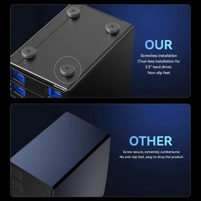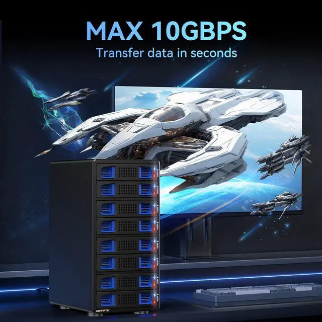 NOTE: Read and write speeds are determined by factors such as hard drive version, computer version, etc... ^^ Reliable External Storage System for IndividualsThe 3.5 hard drive enclosure supports 2.5 / 3.5 inches HDD and SSD, max capacity up to 160TB( 20TB for each hard driveit's a ideal external hard drive enclosure for personal or enterprise using. ^^ No heatThe 8 bay hard drive reader built in Aluminum-Alloy materials and two 2.9 inch Fans. Maximize the security of your data. NOTEFan noise is around 40-50 decibels, not recommended if you are very sensitive to noise. ^^ Hot Swappable ConvenienceThe HDD enclosure supports hot swapping, allowing users to replace hard drives without powering off the device. This feature enhances convenience and efficiency in data transfer processes. ^^ Daisy Chain ExpansionAdd a USB HOST port for external hard drive enclosure and daisy chain to expand capacity. Expansion 480TB storage through daisy chain up to 3 devices ^^ Stable power supplyEquipped with DC 12V20A power adapter to provide stability for high-speed transmission. ^^ Wide Compatibility, Plug and PlayEquipped with USB A/C Gen 2 Cable. Compatible with Windows 7 and above, Mac 9.1 and above, Linux.