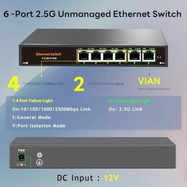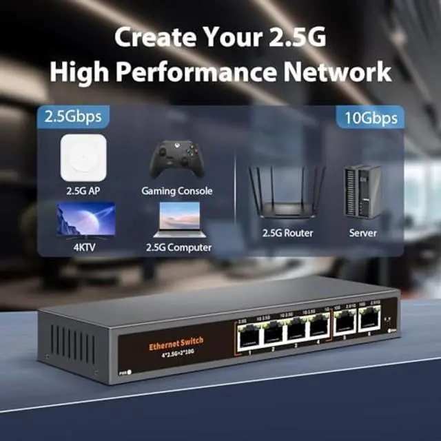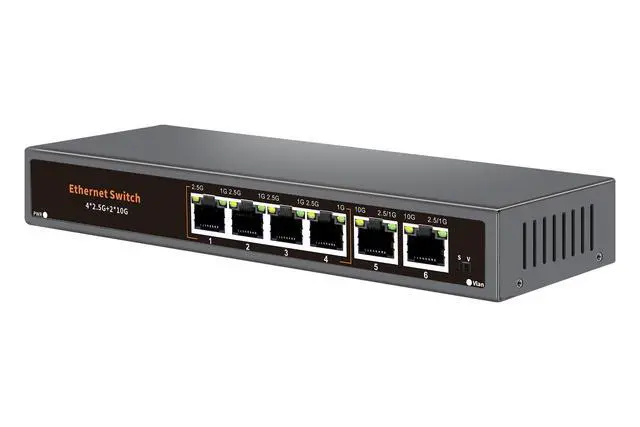 Ethernet Switch: Including 4* 2.5G Base-T Ports and 2*10G RJ45 Uplink Port, compatible with 100/1000/2500Mbps, the unmanaged switch is equipped with a 60Gbps switching capacity.
