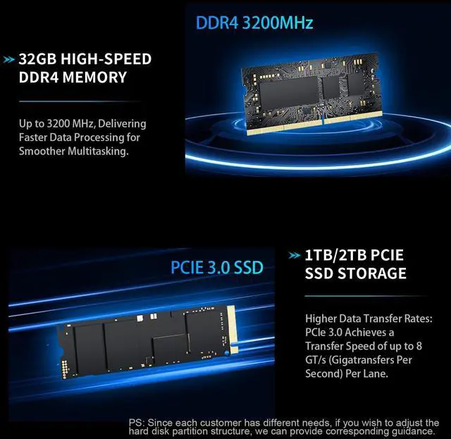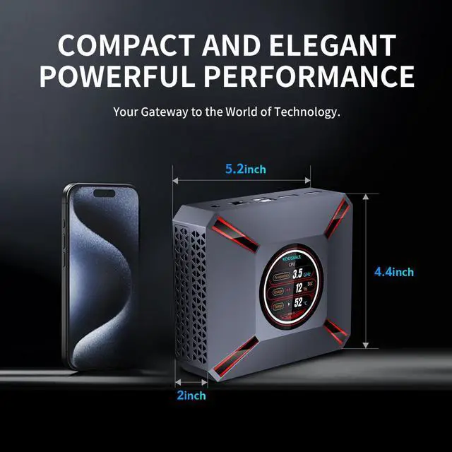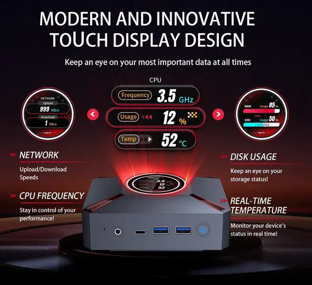 Smart Display MonitoringThis Mini PC features a built-in smart display on the lid that shows real-time system info, including CPU frequency, usage, temp, Network up/download and Memory usage. You can easily monitor performance at a glanceideal for maintaining efficiency and control, all while enjoying a sleek and modern design ^^ Powerful Core i9 CPUPowered by the Core i9-12900HK (14 cores, 20 threads, up to 5.0GH z), with 24 MB of cache. Our Mini PC i9 delivers fast and responsive performance for multitasking, work, streaming, or home entertainment ^^ 32GB DDR4 RAM & 1TB StorageComes with 32GB DDR4 RAM for quick boot-up and smooth operation.