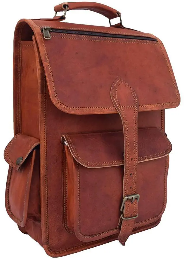 Inside: 1 padded partition to keep 13" Laptop. 2" wide Padded and 40" Long adjustable leather shoulder straps with hand carry Bag made in a pet free and smoke free house 2. Material Description- Genuine Goat Leather Processed, no bad smell Naturally tanned with sunflower oil only, no use of dye or chemicals Inside flap is nicely lined with durable canvas lining. Heavy Duty Antique Brass Solid Accessories Double stitching for more durability and better look 3. CHARACTERISTICS OF HANDMADE LEATHER BAGS- Bag is hand cut, and hand stitched. Each one is individually made pure handmade bag with lasting durability. Each leather satchel is a totally natural product therefore the colors and the finish can vary from one piece to the next. Parts from several hides may be used to make a single leather bag. So there may be some variation in color and the textures to the different parts of a bag, which will create a wonderfully unique effect. Natural lines and marks in the leather are left fully exposed. There may also be visible creases in the leather. These features go to show the genuine origin of our leather satchels and messengers bags, they form part of the bag and not affect its durability.