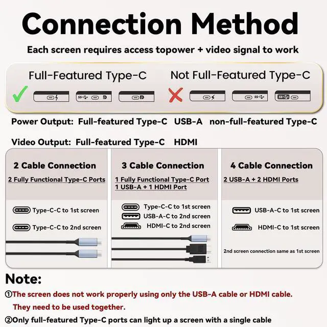 ^^ [Efficient Customer Service]: All products are guaranteed for one year. If you can't light up both screen extenders successfully, please feel free to contact the after-sales team and we will reply within 24 hours. If you are using HDMI+USB-A, please connect the USB-A cable first and then the HDMI cable. If the screen shows No Signal, simply disconnect the HDMI cable and reconnect it.