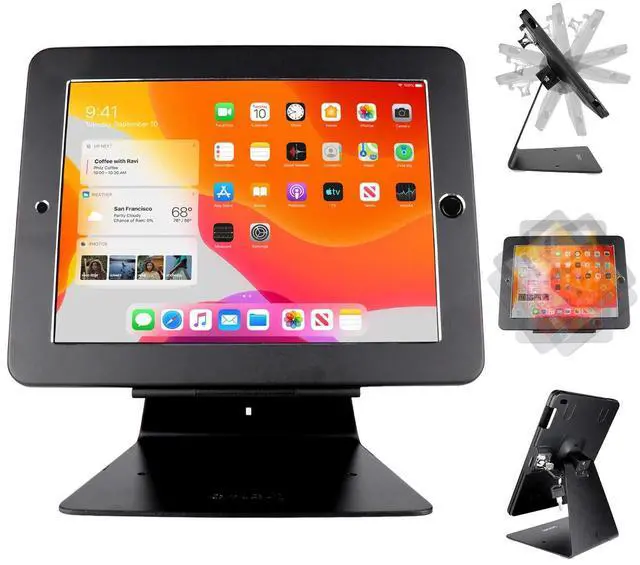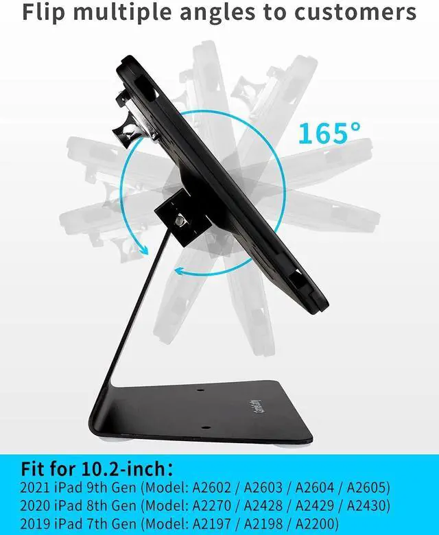FLIP & ROTATE DESIGN - This stand can flip the iPad to the opposite side, so it can face the customers. The 360 degree rotating screen makes it easily adjust viewing angle or rotate for horizontal or vertical views. The stand base itself does not rotate. ^^ COMPATIBLE WITH MODELS - It's compatible with 10.2 -inch 2021 iPad 9th