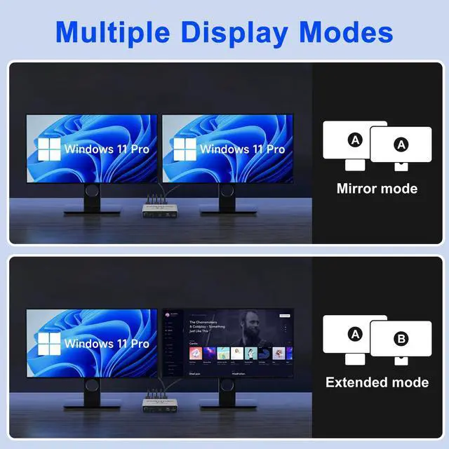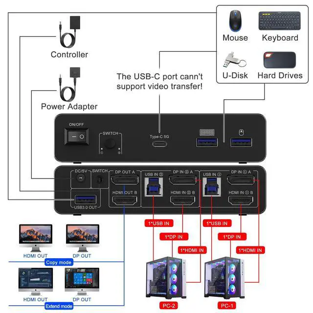 Connectivity & Sharing: This KVM switch 2 monitors 2 computers features Type-C + 3 USB 3.0 ports delivering 5Gbps transfer speeds - 10x faster than USB 2.0. The KVM switches 2 ports design enables seamless sharing of printers, scanners, webcams, and other peripherals between two systems. Compatible with Windows, Mac OS, Linux, and Unix systems. ^^ Dual Operation Modes & Flexible Control: The KVM switch for 2 computers supports both mirror and duplicate/extended display modes. Switch between computers using either front panel buttons or the included wired controller.