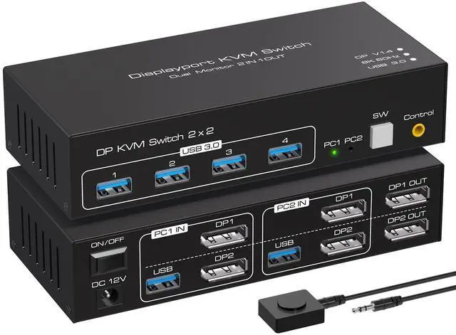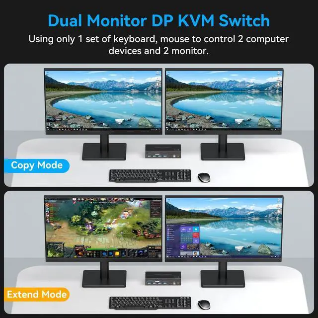 Display Port KVM Switch 2 PC 2 MonitorThis KVM Switch 2 monitors 2 computers display port allows you to control 2 computers or laptops by 1 set of keyboard mouse, share 4 USB 3.0 devices and 2 monitors, support extend mode and copy mode.
