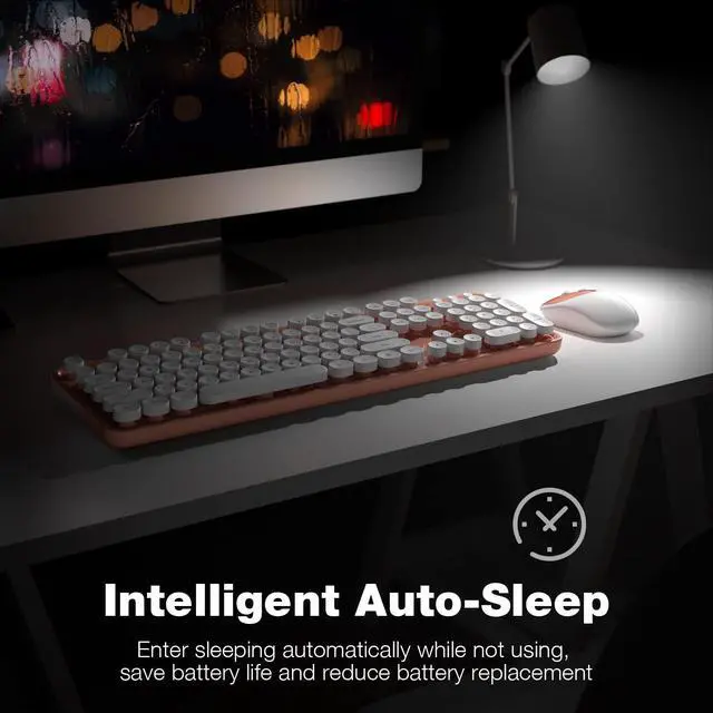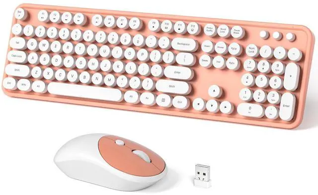 Introducing the Wireless Keyboard and Mouse Combo, a retro-inspired set that combines functionality with style. This full-size keyboard and mouse duo features a 2.4G plug-and-play connection, allowing you to seamlessly integrate it with your Windows computer, desktop, PC, or notebook. The typewriter-inspired round keycaps and colorful pink design add a touch of nostalgia and personality to your workspace. With its comfortable and ergonomic design, this combo ensures effortless typing and precise cursor control. Experience the perfect blend of vintage charm and modern convenience with the Wireless Keyboard and Mouse Combo.