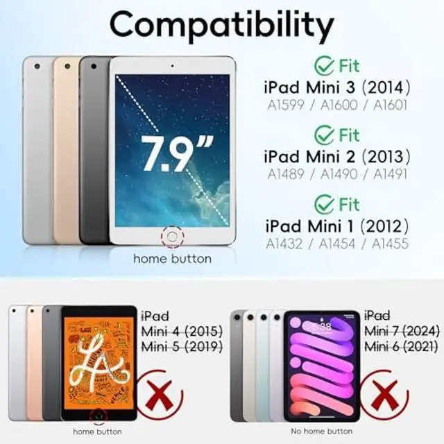 [Compatibility] Specially design for Apple iPad Mini 1(A1432, A1454, A1455), Mini 2(A1489, A1490, A1491), Mini 3(A1599, A1600, A1601); NOT compatible with any other model device. (Screen Protector and Apple Pencil NOT Included) ^^ [Full Body 3-Layer Protection] This iPad mini3/2/1 case is made of premium hard plastic and soft silicone. Three layer structure design, providing full body protection prevent from drops, shocks, bumps, scratches and dirt. No worry your iPad would slip out of your kids' hands and break. Full access to all ports, buttons and cameras without removing the case.