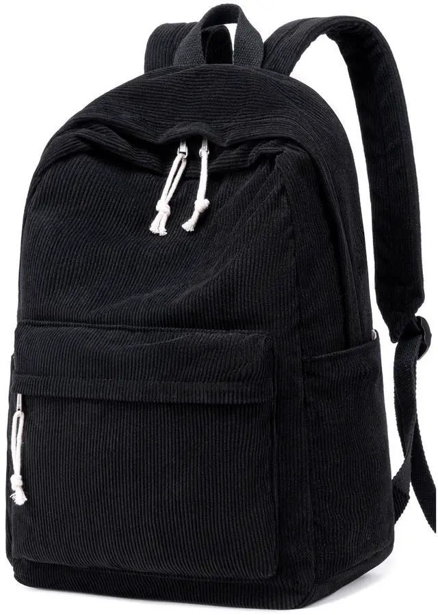The backpack for women capacity: 24L. Suitable for middle schooler, high schooler, college students, and workers. ^^ Multiple pockets and compartments. This black school bag for teen girls has a roomy main pockets, which can carry all of your textbooks, lunch, binders anything you may need, especially the compartment for large laptop. The front pocket can put your pens, keys, and wallets. The two side pockets can put a water bottle, selfie sticks, flashlights or umbrella. Its easy to keep everything organized with so many pockets in it. ^^ Cute classical black corduroy material is soft, durable, and machine washable. This black school bag for teen girls can hold up the weight of everything a highschooler needs in their pack. This bookbag for women perfect for travel carry on backapck wherever you want to go. ^^ Ergonomically designed. The casual backpacks for women with adjustable padded shoulder straps for carrying comfortable, relieves shoulder pressure. The grab handle on the top is reinforced, can be hung anywhere. Smooth SBS zipper is sturdy and durable, with drawstring design, playful and cute.