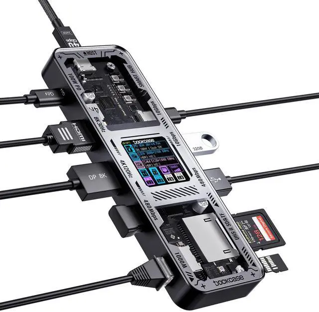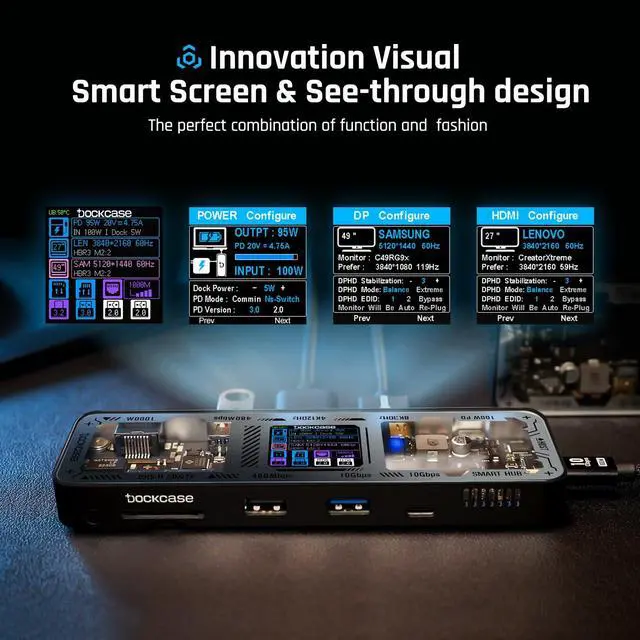 Dockcase Smart USB-C Hub: 10-in-1 Explorer Edition, the ultimate smart hub for your workspace. With an adjustable function display combined with versatile ports and connections, you can easily expand your laptop or desktop computer into a complete workstation ^^ Huge 10