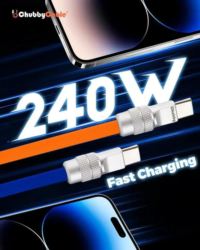 • 240W Super-Fast Charging & Data Transfer: ChubbyCable USB-C to USB-C cable delivers up to 240W ultra-fast charging and stable data transfer, while USB-A to USB-C supports 60120W. NOTE: Fast charging requires a complete system including a compatible charger, device, cable, and internal power management chip. Built with USB 2.0 (480 Mbps) for reliable syncing and supports CarPlay for smooth in-car connectivity