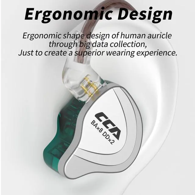 "4BA+1DD iem headphone cca c10 wired earphone adopt the self-customized four 30095+50060 moving iron units greatly, which improve the high-frequency density and extension performance. The abundant mid-high frequency makes voices feel full and sweet, and the sound is naturally clear. " ^^ "Professional Acoustic Tuning CCA C1O wired earbuds earphone through the exquisite circuit crossover design, accurate adjustment, let the three-frequeno connection smoooth 10 sound units each with a finedivision of labor, complement each other to playbeyond the imagination of the sound andlongitudinal sound field. " ^^ "Ergonomic Design& Comfortable to Wear CCA C10 in ear monitor headphone adopts ergonomic shape design of human auriclethrough big data collection.