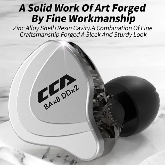 Just to create a superior wearing experience" ^^ "2PIN 0.75MM Detachable cable CCA C10 Iem headphone cable equips detachable cable. Detachable cable system enables multiple connectivity options for long-term device compatibility, upgrades, and ease of maintenance. " ^^ "Durable& Unique design The cca c10 wired headphone adopts durable Zinc Alloy Shell+Resi. High quality function matches form with an extremely lightweight yet durable Zinc Alloy Shell+Resin. A Combination Of Fine Craftsmanship Forged A Sleek And Sturdy Look, The CCA C10 can handle any condition you put them in, whether it's at the bottom of your gym bag or just casual listening.