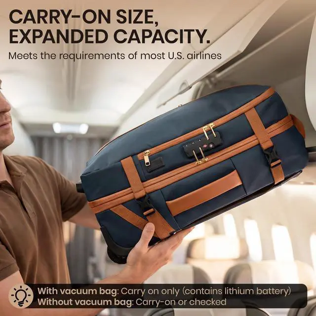More Practical Features: This vacuum backpack travel with pump incorporates 7 versatile pockets to streamline your packing. These include a dedicated vacuum compression bag for clothing, a wet/dry separation pouch for damp items, a padded laptop compartment, a side water bottle pocket, and three organizer pockets for small essentials. The expandable design allows the capacity to be increased. Ample storage that complies with airline carry-on standards, balancing space and convenience
