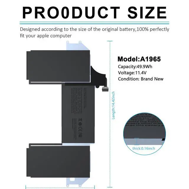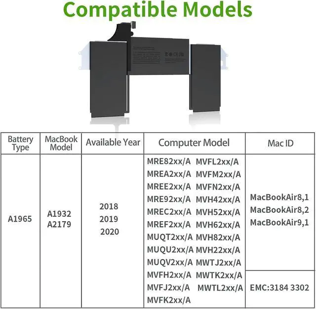 ^^ Compatible Models: A1965 laptop Battery Replacement for MacBook Air 13" 13.3" Late 2018 2019 A1932 (EMC 3184), Early 2020 A2179 (EMC 3302) MRE82xx/A MREA2xx/A MREE2xx/A MRE92xx/A MREC2xx/A MREF2xx/A MUQT2xx/A MUQU2xx/A MUQV2xx/A MVFH2xx/A MVFJ2xx/A MVFK2xx/A MVFL2xx/A MVFM2xx/A MVFN2xx/A MVH42xx/A MVH52xx/A MVH62xx/A MVH82xx/A MVH22xx/A MWTJ2xx/A MWTK2xx/A MWTL2xx/A ^^ High Quality & SafetyA1965laptop batteries undergo extensive quality checks to ensure high quality. Grade A cells ensure fast charging and low power consumption, and built-in circuit protection ensures both safety and stability. Certified by CE/FCC/ROHS ^^ Warranty & Service60 day refund, 12 month warranty (send a new replacement battery). If you have any questions, please contact us and we will reply by email within 24 hours.