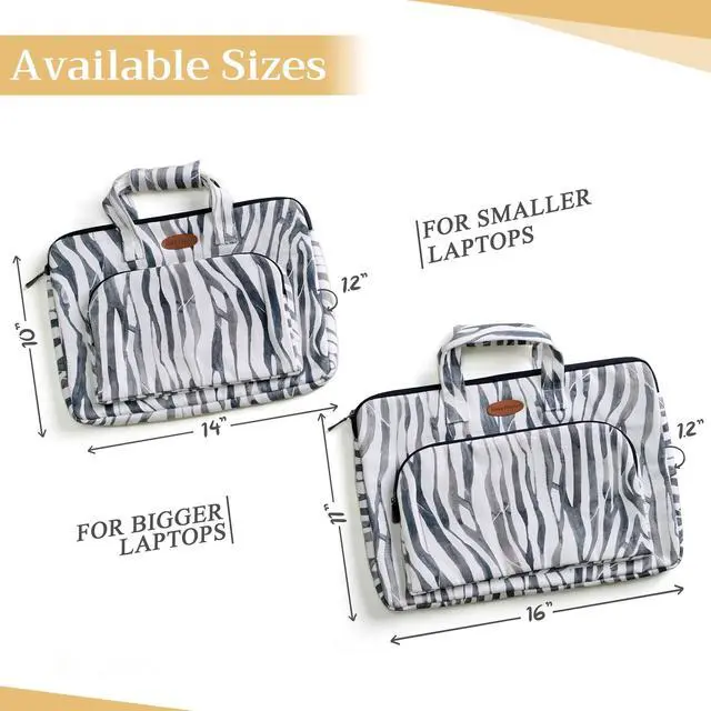 Artsy Designs and Vibrant patterns in vibrant colors provide huge visual interest, setting our bags apart. It is a versatile choice for just daily use, travel or commuting and a true delight to carry around ^^ Comes in two sizes o Small 14 Width, 10 Length, 1.2 Deep (Outer dimension) Compatible with 12- 13.3 Laptops / Ultrabooks, 13- 13.5 Laptops / Notebooks / Ultabooks. o Large 16 Width, 11 Length, 1.2 Deep (Outer dimension) Compatible with 15 Macbook air / Macbook pro, 15.3 ipad pro and most 14- 14.56 Laptops / Notebooks / Ultrabooks ^^ There is an extra removable holder on the handles.