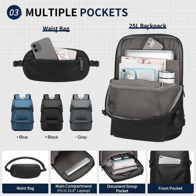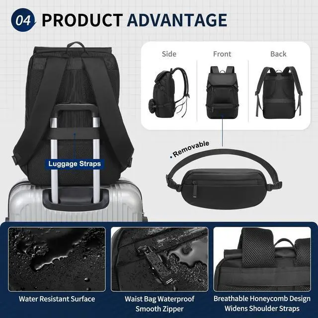 -2-in-1 Design with Removable Belt Bag- --This laptop backpack features a detachable belt bag that can be used separately as a crossbody or shoulder bag. Perfect for quick outings, leaving the main backpack behind for hassle-free travel ^^ -Multiple Pocket Storage- --Designed with multiple compartments, this travel backpack can hold a 15.6 -inch laptop, books, clothes, and essentials. Keep your belongings organized and ready for work, college, or trips ^^ -Durable and Water-Resistant Materials- --Made from sturdy, water-resistant fabric, this backpack offers reliable protection for your items. The detachable belt bag also features a water-resistant zipper for valuables during unexpected weather ^^ - Airplane Travel and Daily Use- --This lightweight backpack is Airplane Approved and comes with luggage straps, allowing it to attach to your suitcase handle for convenient transport easily.