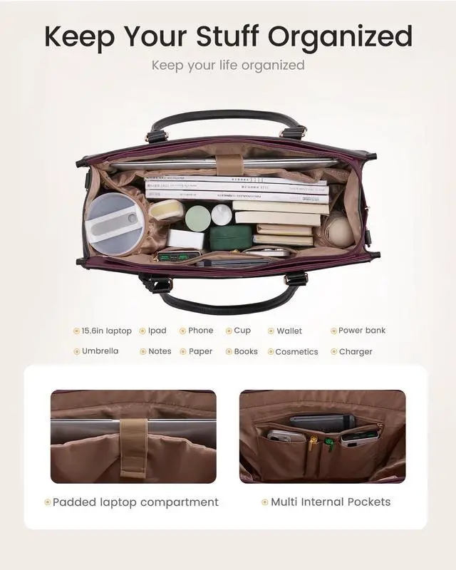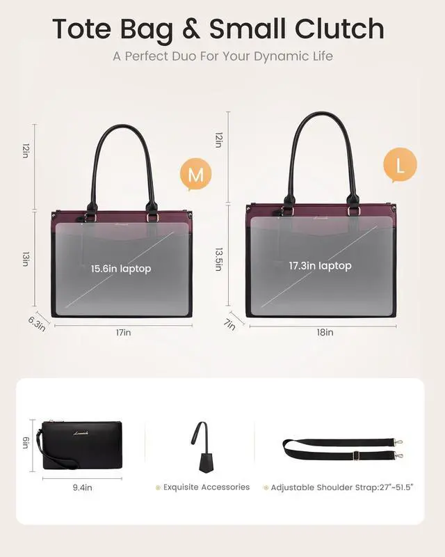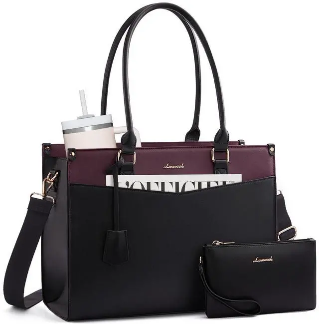 2-in-1 Laptop Tote Bag & Large CapacityThis versatile Lovevook laptop bag for women comes with a removable clutch, giving you two stylish women work bags in one. Its spacious interior (17"L x 13"H x 6.3"W ) features a dedicated padded compartment to securely fit laptops and tablets up to 15.6 inches, plus additional pockets to keep all your essentialslike your phone, documents, water bottle, and even cosmetics in the clutchneatly organized. ^^ Elastic Water Bottle PocketsNever sacrifice a sip. The thoughtfully designed elasticated inside pocket on this LOVEVOOK tote bag securely holds your favorite water bottle.