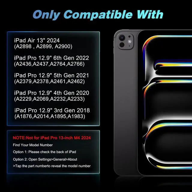 Compatibility - Compatible with iPad Air 13 inch 2024, iPad Pro 12.9 ( 6th/5th/4th/3rd gen), models include 2024 Air 13 inch(A2898, A2899, A2900), 2022 12.9 inch Pro 6th Gen(A2436, A2437, A2764, A2766); 2021 12.9 inch Pro 5th Generation (A2378, A2379, A2461, A2462); 2020 12.9 inch Pro 4th Generation (A2229, A2069, A2232, A2233); 2018 12.9 inch Pro 3rd Generation (A1876, A2014, A1895, A1983).