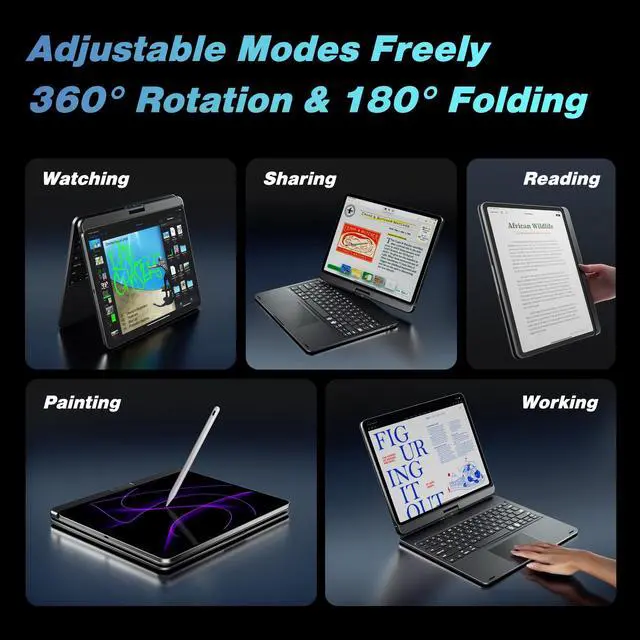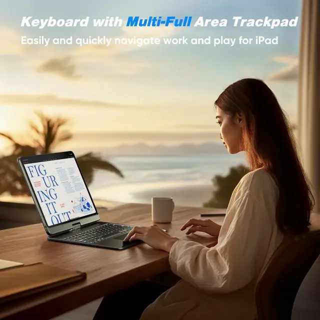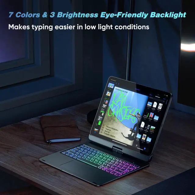 NOTE: NOT FIT FOR IPAD PRO 13 (M4) 2024. We are happy to assist you! If you need to check compatibility, please contact us. ^^ Precision Trackpad - With the iPad Pro 12.9 keyboard and a multi-touch trackpad, navigate your iPad in a whole new way with no external mouse required and transform your iPad Pro into a laptop within a second. Edit documents, browse the web, and build presentations with unparalleled speed, perfect for business, school, and traveling. ^^ 7-Color RGB Backlit Keyboard with Shortcuts - Illuminated typing on a premium keyboard for iPad Air 13 inch with 7 colors backlight that allow an adjustable brightness level, and a full row of PadOS shortcuts, change backlit colors, adjust tablet brightness, volume control, media control, and more can be done with one keypress. ^^ 7 Use Modes - With the 360 hinge (20, 000-cycle stress tested), you could use your iPad in 7 different modes with the iPad 12.9 Pro case with keyboard, and comfortably use the iPad for any task such as writing, drawing, watching videos, and browsing.