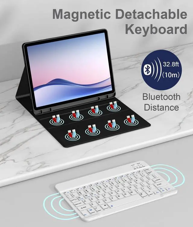 Compatibility- Protective case for Samsung Galaxy Tab A9+ 2023 released (Fit models: SM-X210/X215/X216/X218) & Tab A11+ 2025 released (Fit models: SM-X230/X236/X238). NOT compatible with any other devices. ^^ Pencil Holder Design&Precise cutouts- This Case is designed with a pen holder. The hollow design on the back makes it easy to take out the stylus for use. Precise cutouts allow full use of all features and provide perfect protection for daily use. ^^ Detachable Keyboard&Full Shortcut Keys- The magnetic wireless keyboard can be removed from the case freely. Compatible with Android, iOS, Windows. Just press Fn and corresponding keys (QWE) to change the keyboard system. Hot keys Customized for Galaxy Tab, Full Shortcut Keys give you a more efficient way to use your keyboard. ^^ Long Life Battery&Rechargeable Bluetooth Wireless Keyboard&Instant pairing- With its powerful battery, 2 hours full charge, work for more than 120 hours, stand by for 150 days. It even enters into sleep mode automatically if not in use for 15 minutes. Just Press any key to wake up. Mechanical scissors keyboard, quick rebound, press smoothly. ^^ Premium Material&Super Non-slip- honeycomb grid pattern design is better for 100% heat release and extend your machines service life by more than 30%.