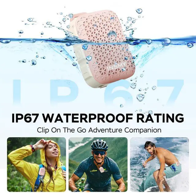 Multi-Functional Wearable Design Experience ultimate versatility with INSMY's clip-on speaker featuring a sturdy carabiner clip and attach back for secure attachment to bags, belts. Perfect for hands-free use during work like welding forklift driving, outdoor adventures like hiking fishing, or daily chores. Combines wearable speaker convenience with industrial-grade clip quality for non-slip wear. ^^ IP67 Waterproof & Rugged Durability Built to withstand tough conditions! This waterproof Bluetooth speaker boasts IP67 waterproof rating, surviving rain, spills, or accidental submersion (up to 30 mins). Ideal for construction sites, workshops, or lakeside fishing trips.
