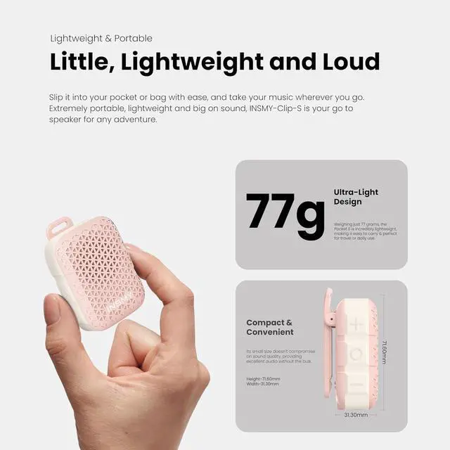 Dustproof and shock-resistant design ensures long-lasting performance. ^^ Ultra-Light & On-The-Go Ready This portable speaker is small and ultra light at just 77g( 2.7 oz)makes it easy to carry in your pocket bag or travel suitcase. This small Bluetooth speaker slips effortlessly into backpacks or clips onto gear. Optimized for active lifestyles - runners, cyclists, and outdoor enthusiasts love its no-bounce design. Power through shifts, weekend hikes, or park strolls without bulk! ^^ Crisp Clear Sound & Stereo Pairing Big sound comes in small packages. Our 5W mini Bluetooth speaker packs a punch with its powerful audio in a compact form factor.