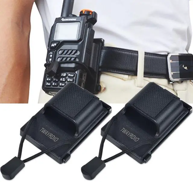 Radio holder compatible for Motorola BaoFeng Kenwood Midland Harris Quansheng TYT HYT two-way radios walkie talkies. The package contains 2 radio holders, each with 2 adjustment sticks and 1 gasket.