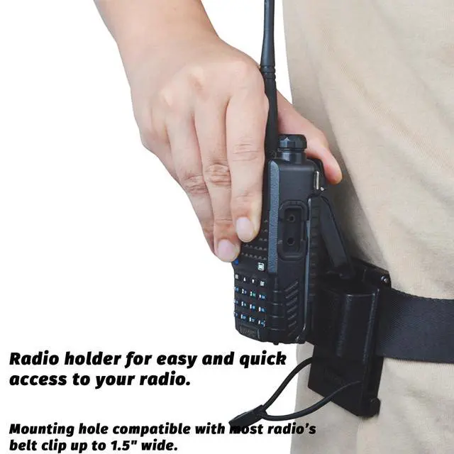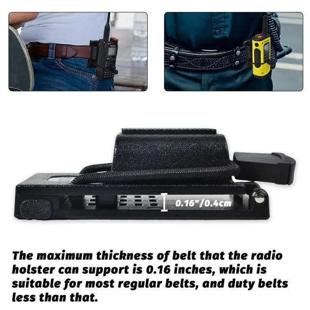Radio holder for easy and quick access to your radio. This radio holster is a good option for people who have trouble removing the walkie-talkie from the belt. Adjustable according to the belt width. Support 1"/ 1.2" / 1.4" / 1.5" / 1.75", maximum 2" wide belt. Insert the adjustment stick into different slots to fit the belts size. Easy to install, and the mounting hole compatible with most radios belt clip up to 1.5" wide. The elastic strap helps keep the radio in place, and the anti-slip pad adds stability and prevents the radio from slipping.