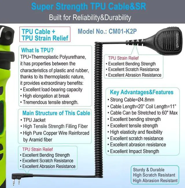 Strength Precise Connector: With TPU (Thermoplastic polyurethane) rubber jacket, internal hard core and Nickel-plated brass plugs, assembled by precise soldering technology and molding technology, the connector of this speaker mic is built for stable connectivity and excellent operating life.