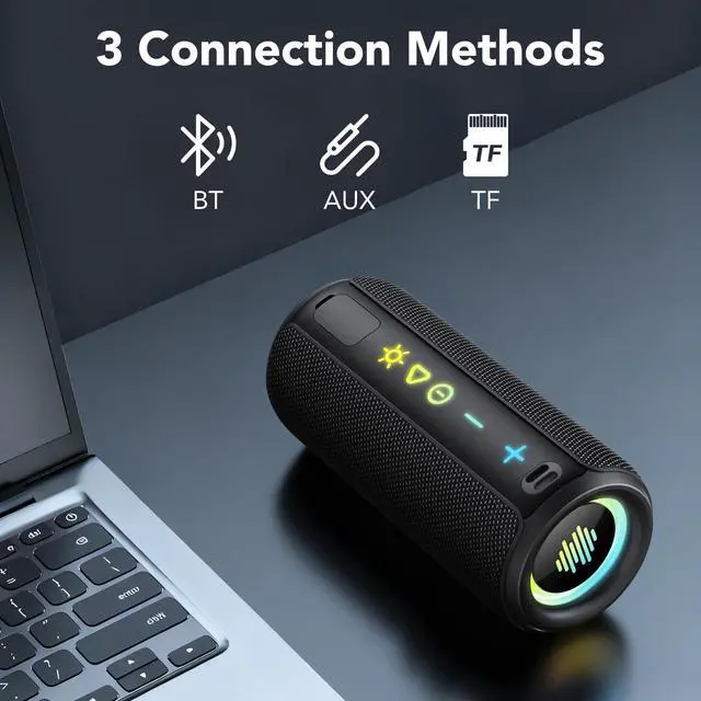 Wide Compatibility: This outdoor speaker bluetooth is equipped with the latest Bluetooth 5.4 technology since 2025, which increases transmission speed by 90% and provides more efficient audio decoding for you to enjoy true high sound quality and low latency. This loud speaker has wide compatibility, can be paired with any Bluetooth device, and supports SD card and AUX connections. ^^ 24H LONG BATTERY LIFE & TWS STEREO: This portable Bluetooth speaker is equipped with a 4000mAh rechargeable lithium battery. With about 3 hours of charging, it delivers up to 24 hours of playtime (at 30% volume with lights off) or talk time with the built-in microphone. Featuring TWS technology, it allows two wireless speakers to be paired together for a stereo sound experience, creating immersive surround-like audio as if you were in a private cinema. ^^ IPX7 WATERPROOF, PORTABLE