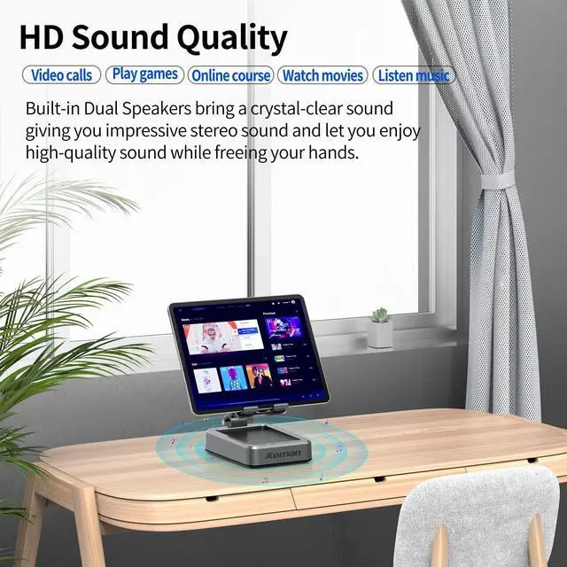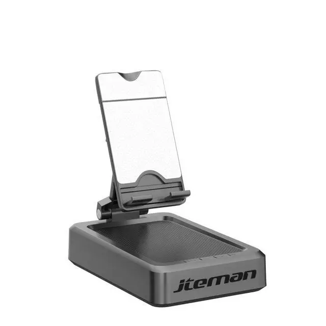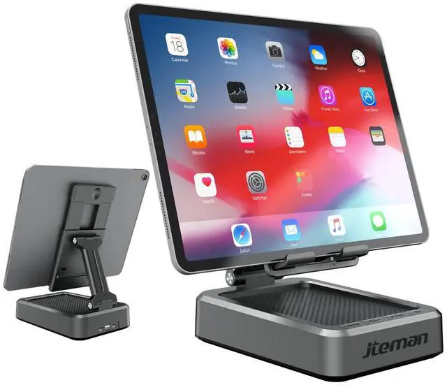 Novel designs 3 in 1 Multi-function Tablet Stand The Tablet Stand for desk is not a simple Tablet Stand, it is with Bluetooth speakers and a phone charging station. When using iPad for study, watching movie or listening music, the Tablet Stand can be used both as a stand and as a Bluetooth speakers. The charging station of stand can charge your iPad and other devices, such as phone, kindle and e-readers when the Tablet Stand connected the power, it will be a cool gadgets for you ^^ Higher Quality Louder VolumeJteman Bluetooth Speakers with Tablet Stand, Built-in Dual Speakers let the Volume more louder but not noisy, giving you impressive stereo sound when you enjoying music and movie.