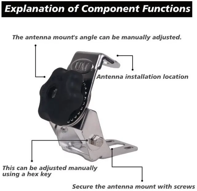 " ^^ Easy Installation: Installing our stainless steel multi-angle antenna mount is a breeze. With clear instructions and all necessary hardware included, you'll have your antenna securely mounted in no time, whether it's on your vehicle, rooftop, wall, or other preferred location.