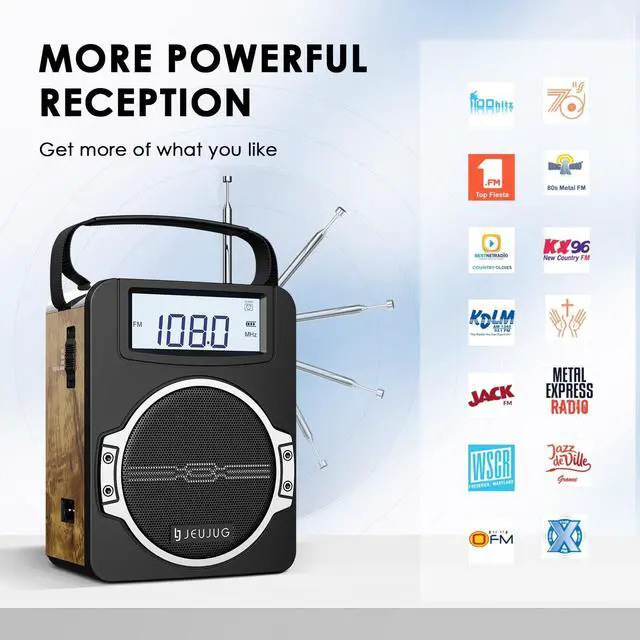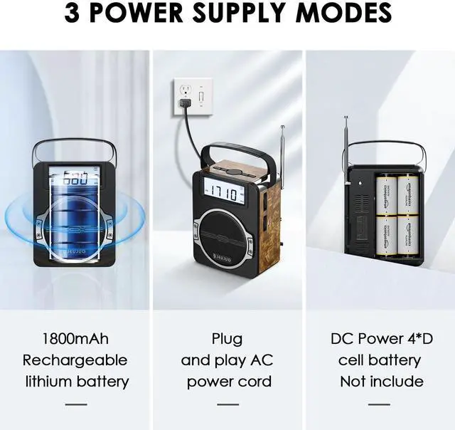 ^^ Battery-Free Operation: Enjoy the flexibility of three power options with JEUJUG digital radio. The built-in 1800mAh rechargeable battery provides up to 10 hours of continuous playback. For those times when you need extra power, you can use the battery compartment to install 4 D-cell batteries as a backup power source. Additionally, the included power cord allows for continuous play and charging, making it ideal for use as a plug-in wall radio at home.